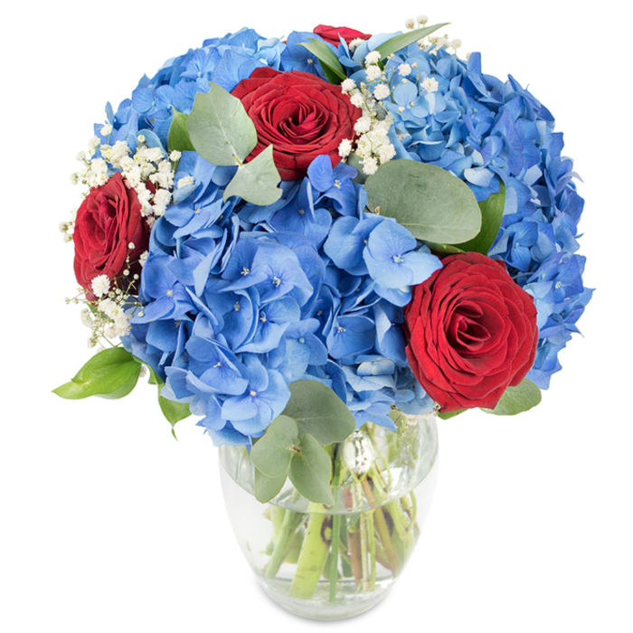 Perfect for anniversaries, birthdays, or simply to show how much you care, this bouquet delivers a heartfelt message without saying a word. The rich red roses symbolise deep love and passion, while the soft blue hydrangea and airy gypsophila add elegance and charm. Flowers are delivered in bud where possible, so you can enjoy watching them open and last longer at home.