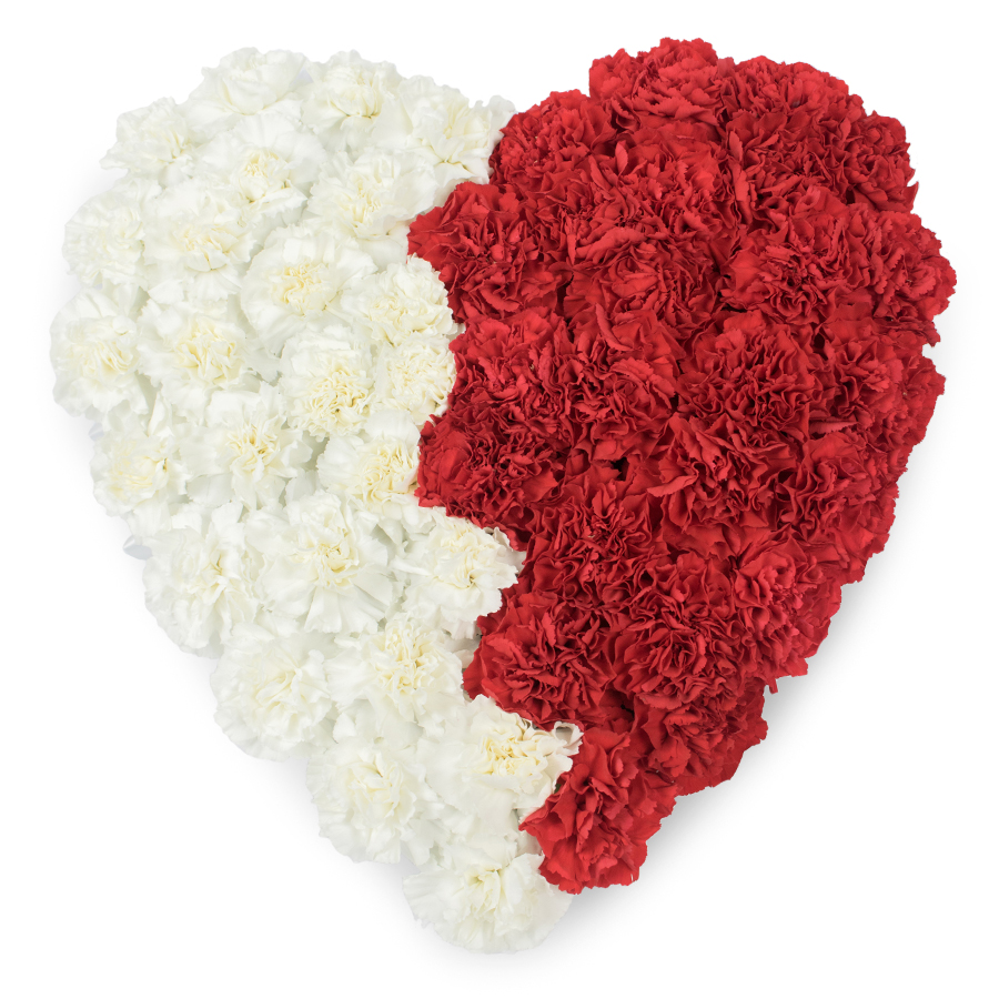 Express your deepest feelings with our Heartfelt Red and White Carnations Floral Arrangement. This elegant bouquet combines a vibrant mix of red and white carnations, thoughtfully arranged into a heart shape to symbolize love and sympathy.